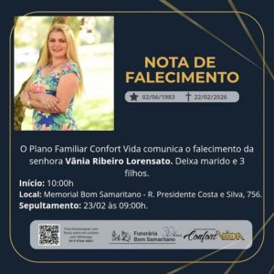 É com profundo pesar que comunicamos o falecimento de Vânia Ribeiro Lorensato, aos 42 anos, moradora do Conjunto Micheletto, em Assis Chateaubriand. Vânia estava há pouco tempo em tratamento contra um câncer, mas infelizmente acabou sendo vencida pela doença. Ela deixa o esposo, três filhos e uma legião de amigos, que hoje lamentam profundamente sua partida precoce. O velório está acontecendo no Memorial Bom Samaritano, em Assis Chateaubriand. O sepultamento acontecerá às 09h00 da manhã desta segunda-feira (23), no Cemitério Municipal Jardim da Paz, também em Assis Chateaubriand. Neste momento…
