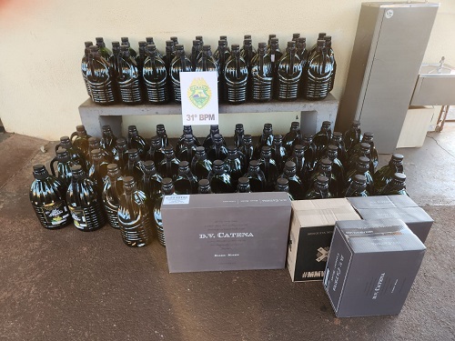 Diante disso, o veículo e ocupantes foram encaminhados a sede do 31 BPM para melhor análise, onde foi constatado a quantidade 81 galões de 05L (405L no Total)de azeite de oliva sem o selo da vigilância sanitária, como também mais 24 garrafas de vinho, ambos os produtos de origem estrangeira.