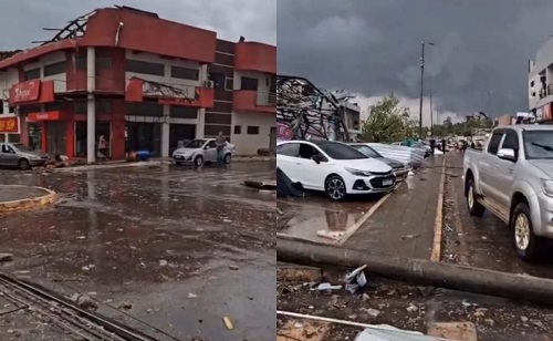 Vídeos que circulam nas redes sociais mostram o cenário de destruição após a passagem do tornado. Casas e estabelecimentos comerciais foram completamente devastados.