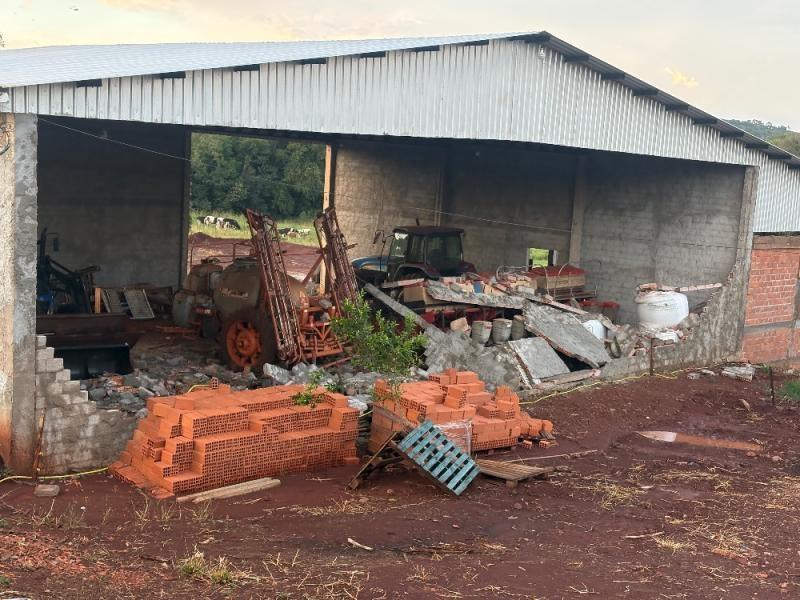 Ainda na mesma propriedade rural, a força dos ventos derrubou a parede de um barracão sobre máquinas agrícolas, deixando danos na plantadeira e pulverizador.