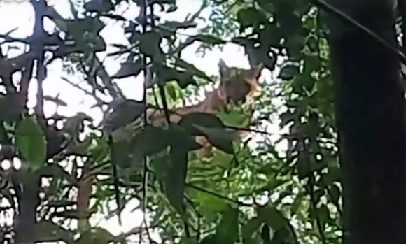 Os cachorros do sítio ao se depararem com a onça latiram bastante na direção dela e com isso ficou acuada na árvore.
